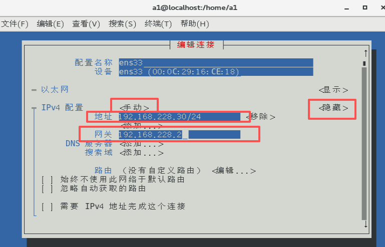第三步:IPv4 配置中,选择“显示”,选择“手动”,地址配置:192.168.228.30/24,