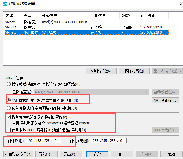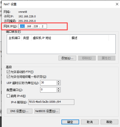 (3)点击“NAT 设置”查看网关,是 192.168.228.2(根据自己 VMWare 的 NAT