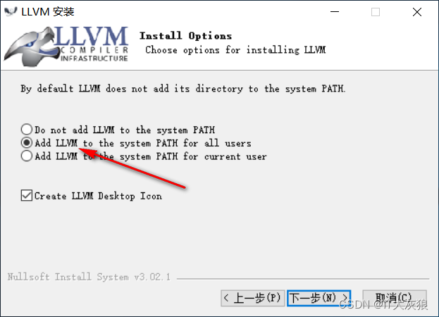 3. 下载后解压缩,双击安装,记得选择将LLVM添加到系统环境变量PATH