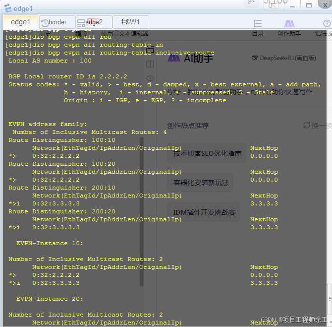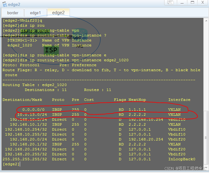 import-route ospf 2 //导入ospf实例路由把学到的出口路由通过bgp传给edge