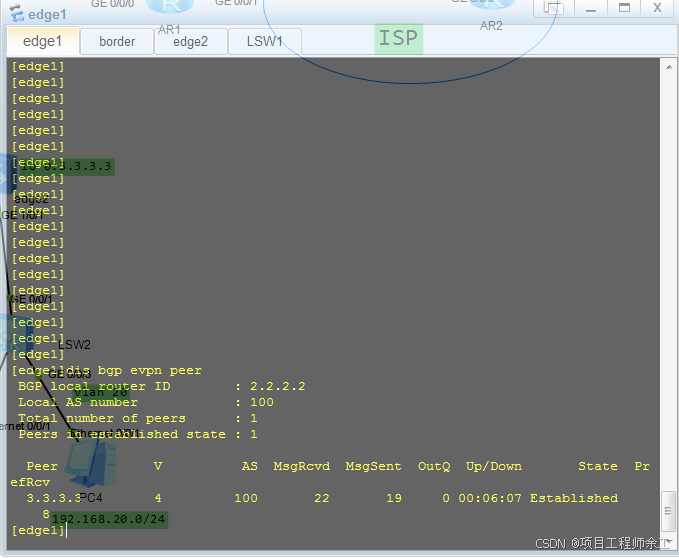 default-route imported //真实环境这条不配默认五类学到的ospf默认路由传不到edge上去,因为bgp中默认不允许引入默认路由