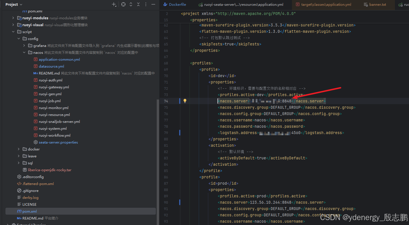 如果你想修改nacos的默认用户名和密码的话,打成jar包前,先去根目录pom文件中,修改相关配置(下图中因为我们是配置测试开发环境的nacos,所以选择id为dev这里的进行修改,可以将ip地址换成公网ip)