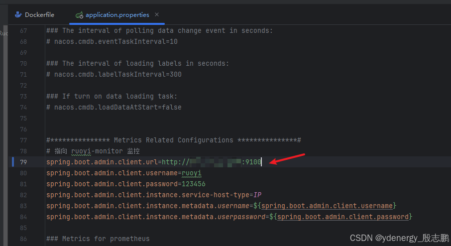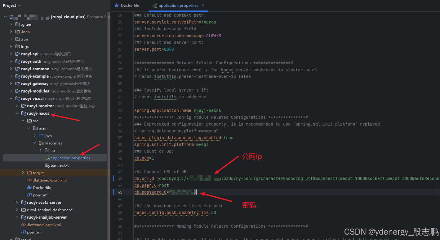 修改nacos服务的配置文件application.properties,需要修改mysql配置信息和上面配置的mysql对应,其次需要修改monitor监控配置,ip地址要写成公网服务器的地址