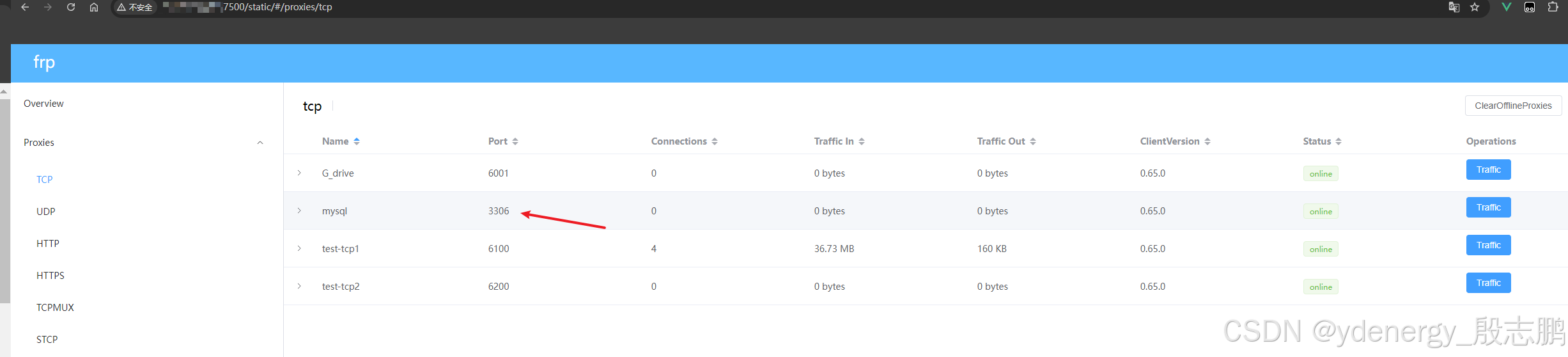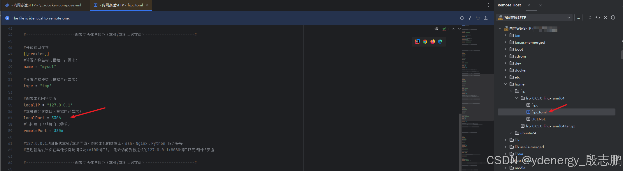 修改frpc.toml文件内容,和上一章节讲解的配置远程ssh连接一样,配置mysql3306端口的穿透连接