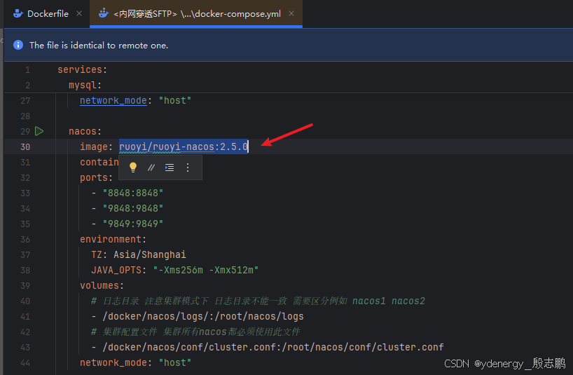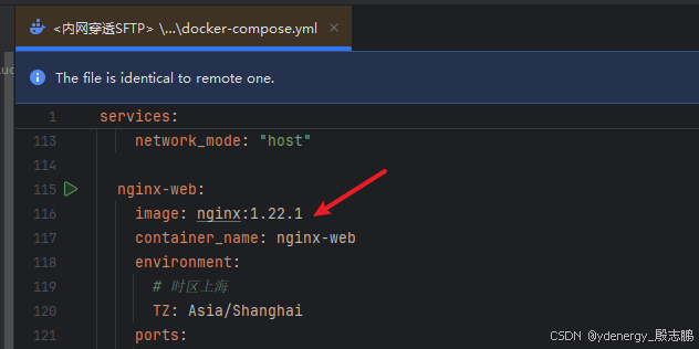 依旧使用docker compose进行运行,先查看docker-compose.yml文件,如果你上一个步骤,制作镜像时,镜像名称使用了其它名字,这里image要对应上,端口等自行配置