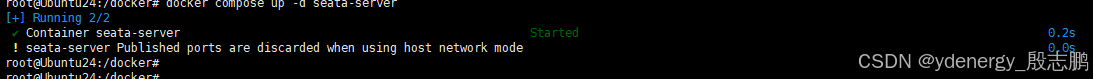 可以发现,这几个容器都提示Published ports are discarded when using host network mode,这是因为我们的docker-compose.yml文件中,指定network_mode: “host”,也就是直接绑定到宿主机的端口上,而我们的命令是端口映射命令,自然是冲突的。就是想要告诉大家,现在这些容器启动是直接在宿主机上绑定这个端口,而不是在容器内部。-d参数是后台运行。