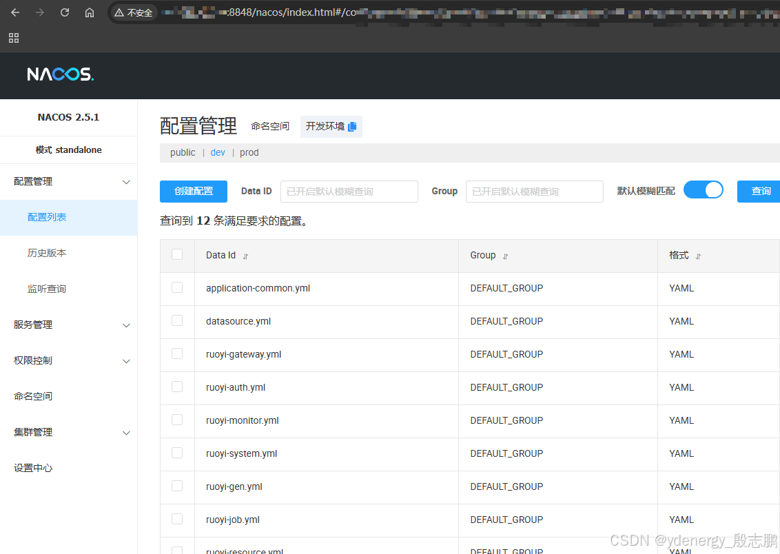 http://公网ip地址:8848/nacos/index.html,因为是dev开发环境,所以选择dev,然后回到第一章节,按步骤,将配置文件上传到nacos(上传时,注意ip地址改成公网ip,主要是redis,mysql)
