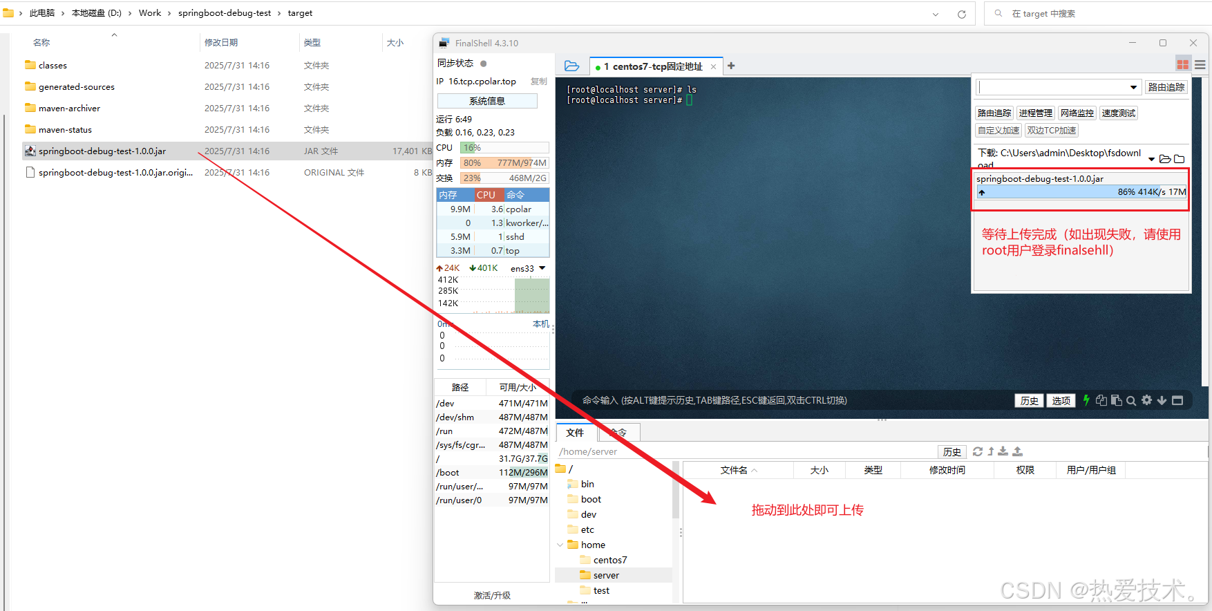 将jar文件直接拖动至`finalshell`空白处即可上传