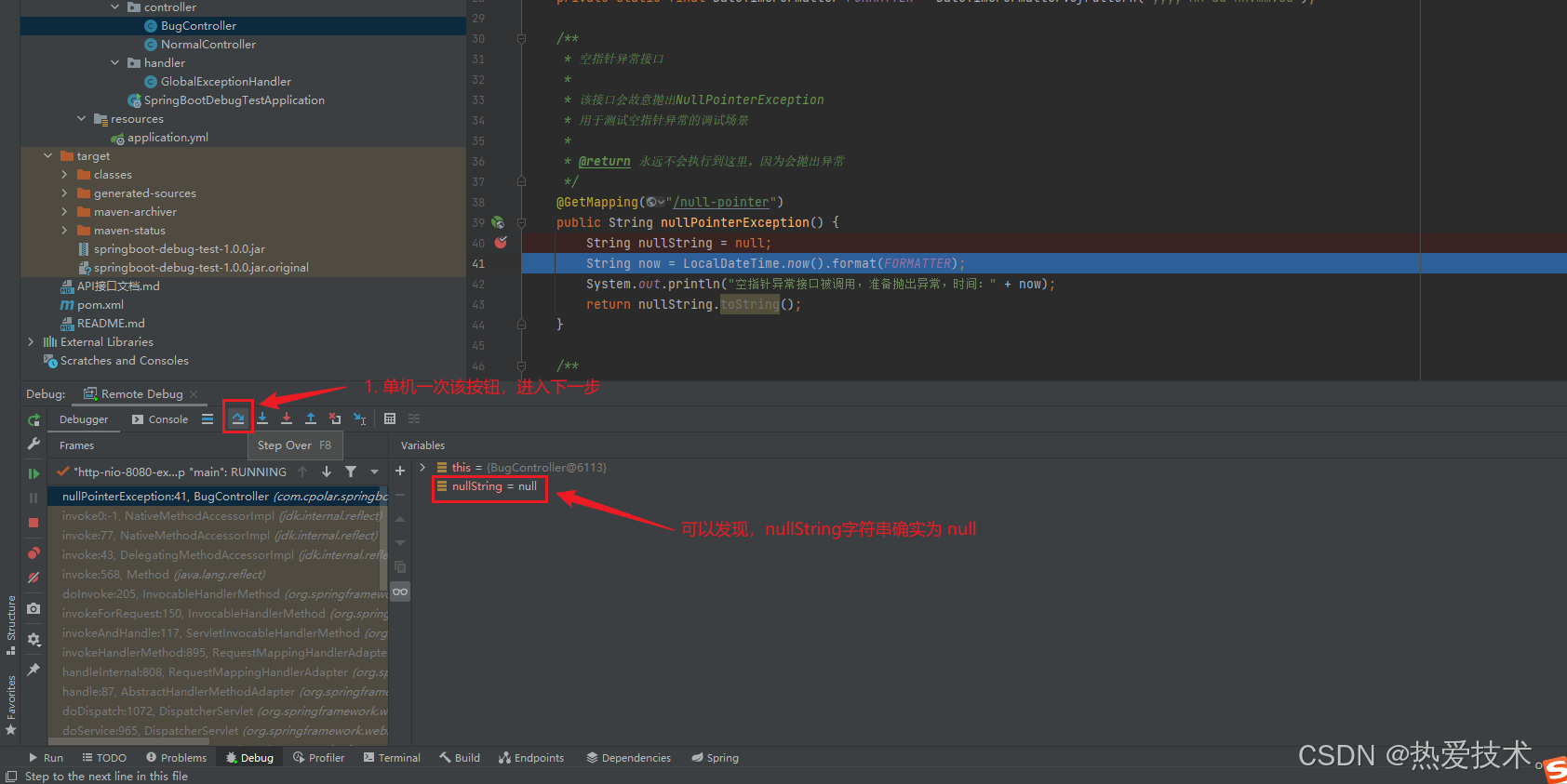 来到`BugController`控制器,里面有一个异常接口`api/bug/null-pointer`,代码如下: