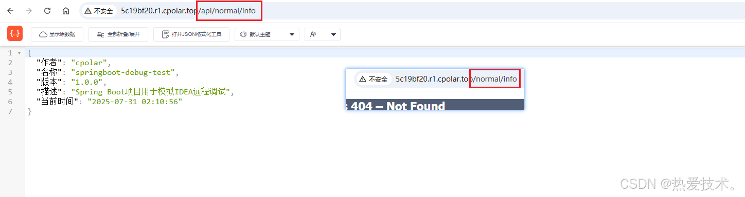 切换到浏览器,然后请求`8080端口的穿透地址`+`异常接口地址`进行请求,如: