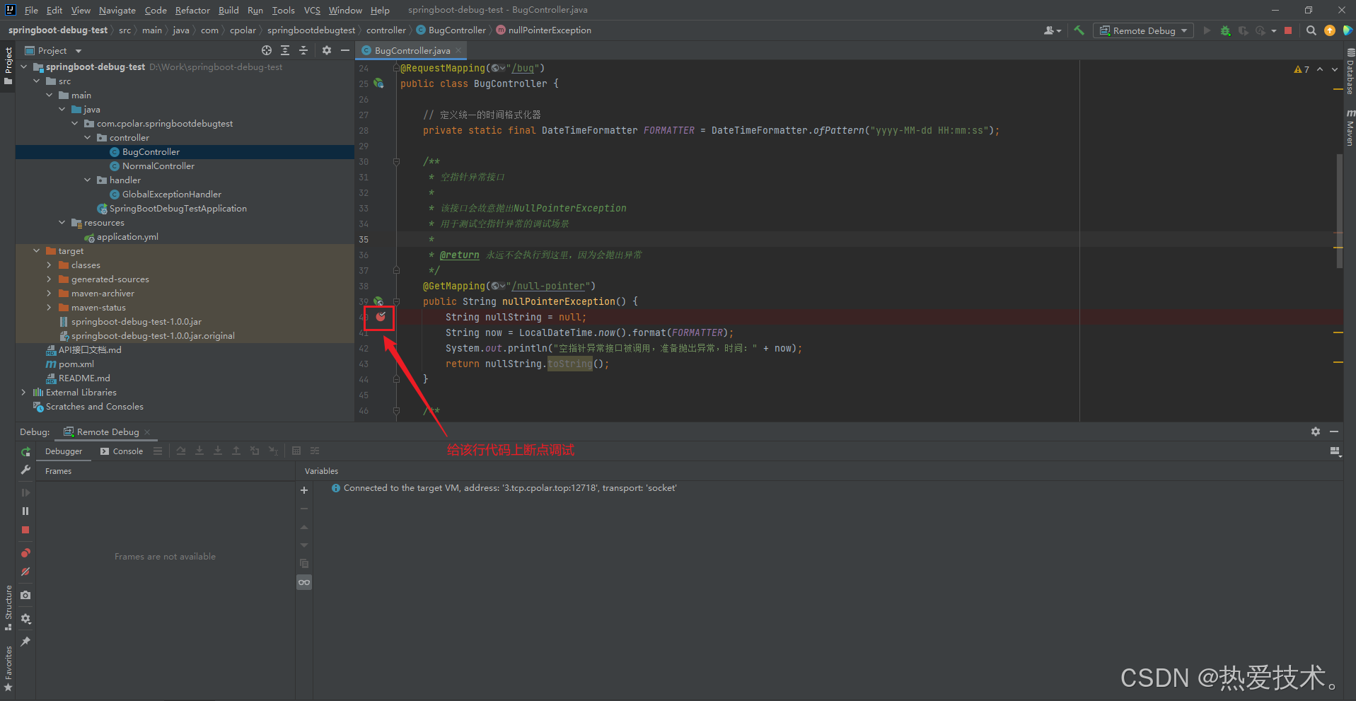 再次请求一次该链接`http://5c19bf20.r1.cpolar.top/api/bug/null-pointer`进行发送http请求,可以看到后端idea中已经进去断点调试了