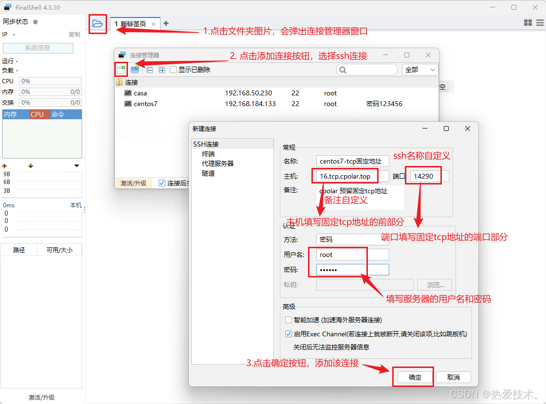 ssh远程工具可以使用`MobaXterm`、`Xshell`或者`FinalShell`都可以,这里采用`FinalShell`进行远程登录演示