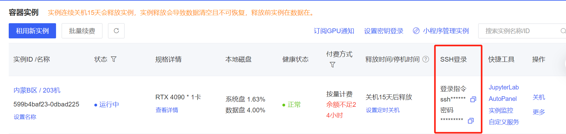复制自己实例的SSH指令,比如:ssh -p 50762 root@region-2.autodl.com