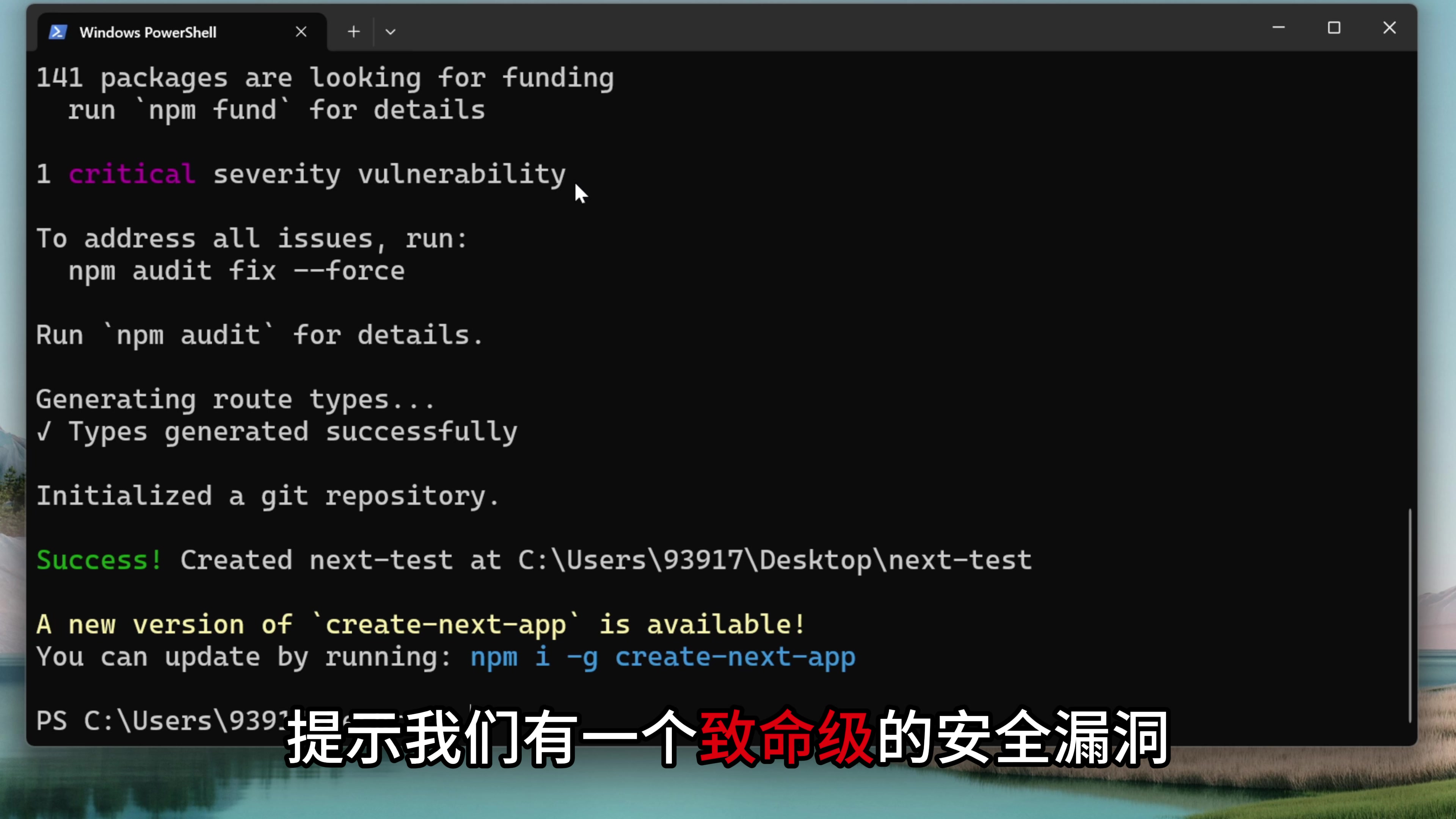 这里最新的版本 16.0.7 已经修复了这个漏洞,所以我回退一个版本,用 16.0.6 来复现一下攻击过程。 执行这个命令的前提是,你电脑上需要安装过 Node.js。回车,这里输入一个项目的名字,我叫 next-test,回车,然后一路点击回车就行了。命令执行完了,我们看到这里提示我们有一个致命级的安全漏洞。