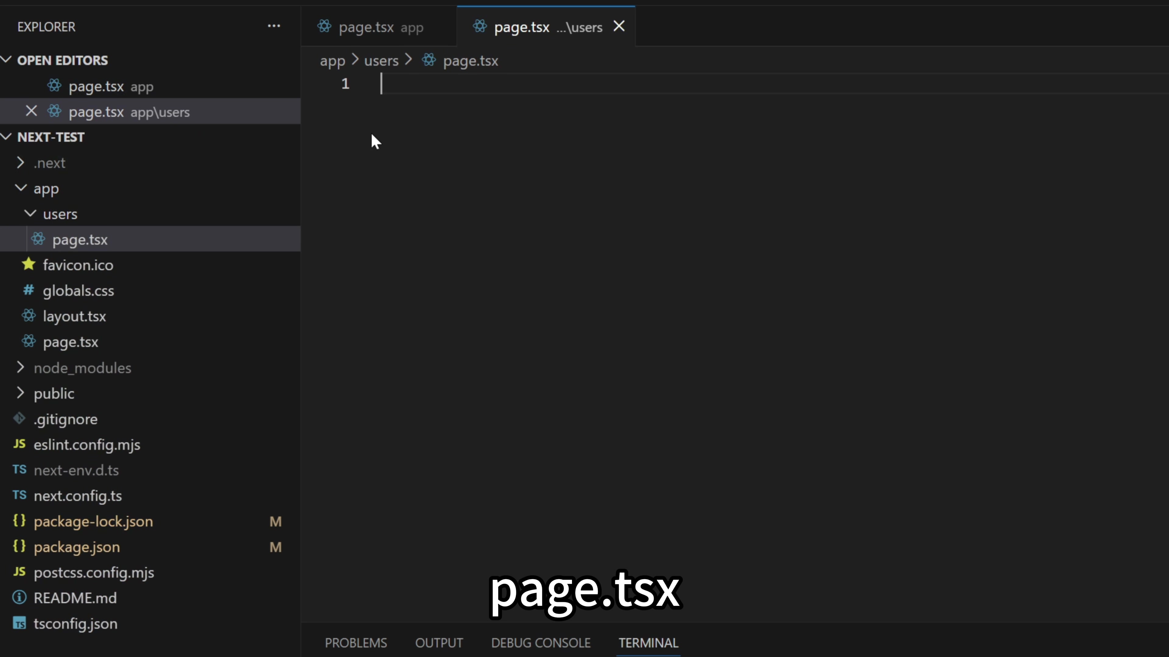 这里我在 app 目录下面新建一个文件夹叫 users,在文件夹里面再新建一个文件 page.tsx。