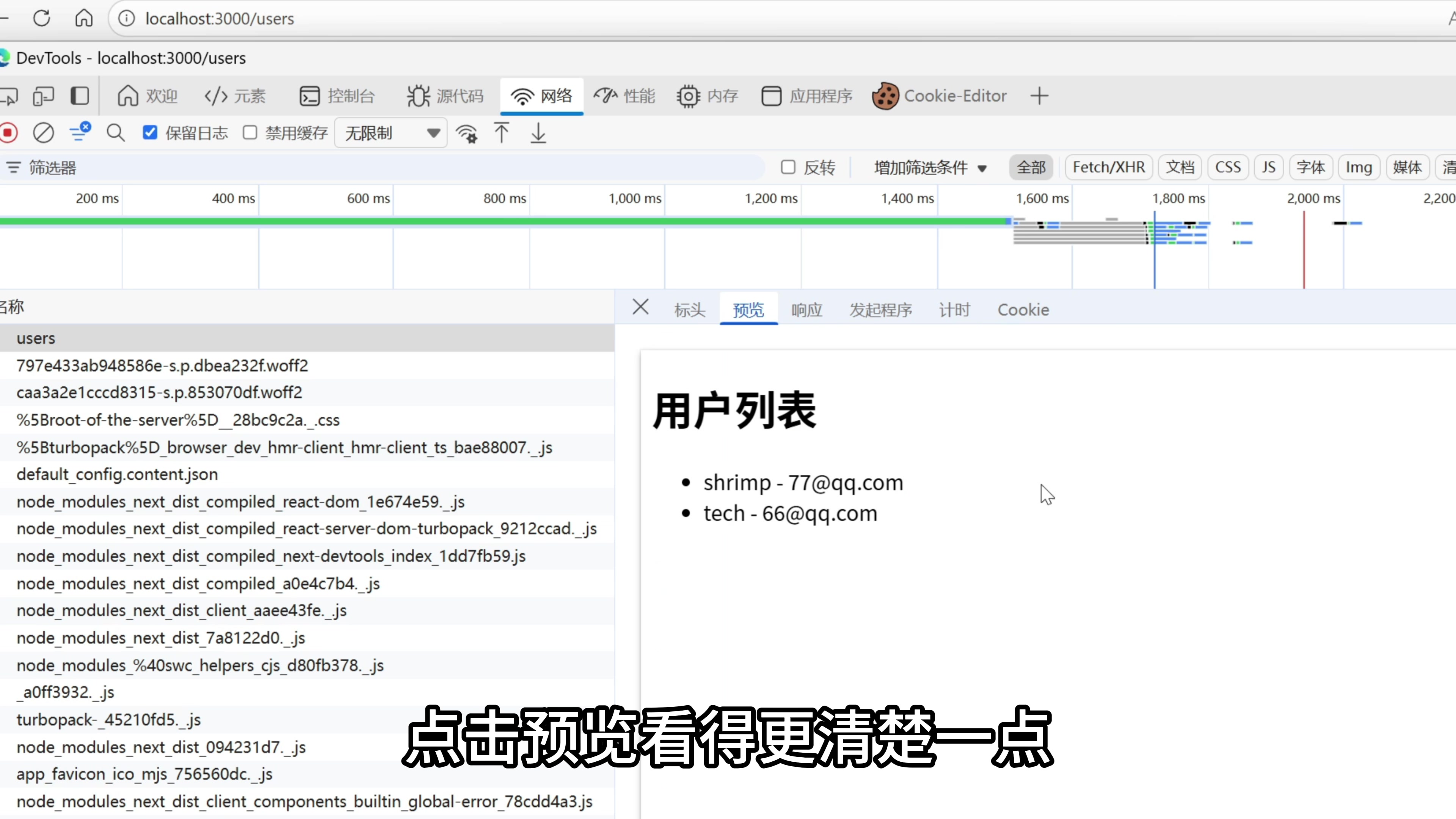 使用这段代码之前,我们需要先安装 postgres 的依赖。打开一个命令行窗口,执行 npm install postgres。依赖安装好了,我们来看一下这段代码的逻辑。这里新建了一个 postgres 的数据库连接,然后我们直接从数据库里面查询到了所有的用户,然后在下面的 React 组件里面遍历这个用户的数组,把用户的名字还有 Email 都组装好,最终组装成一个页面。我们来试一下,在浏览器这边,我们只需要输入跟目录同样的名字,也就是 /users,我们看到用户列表显示出来了。