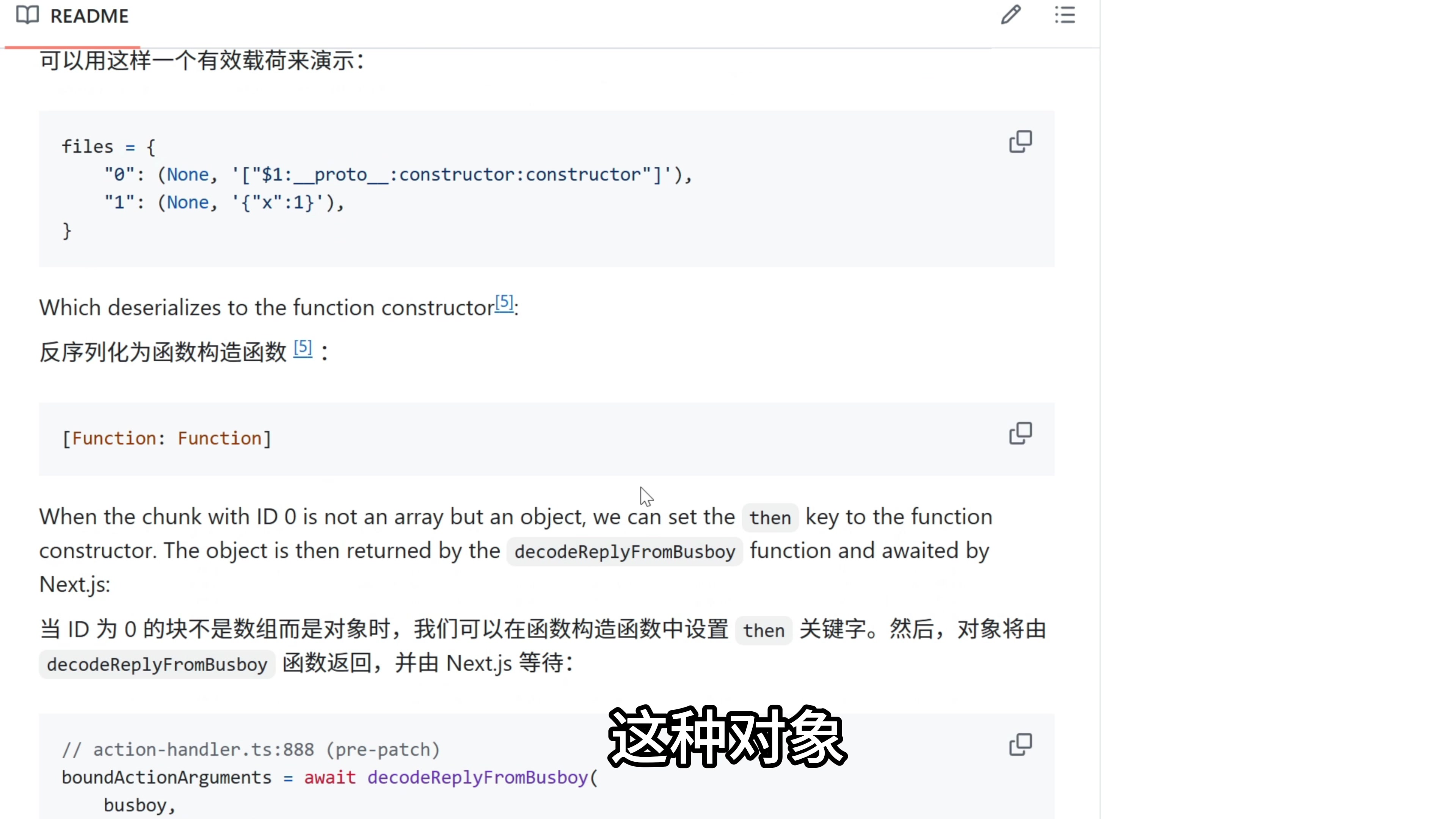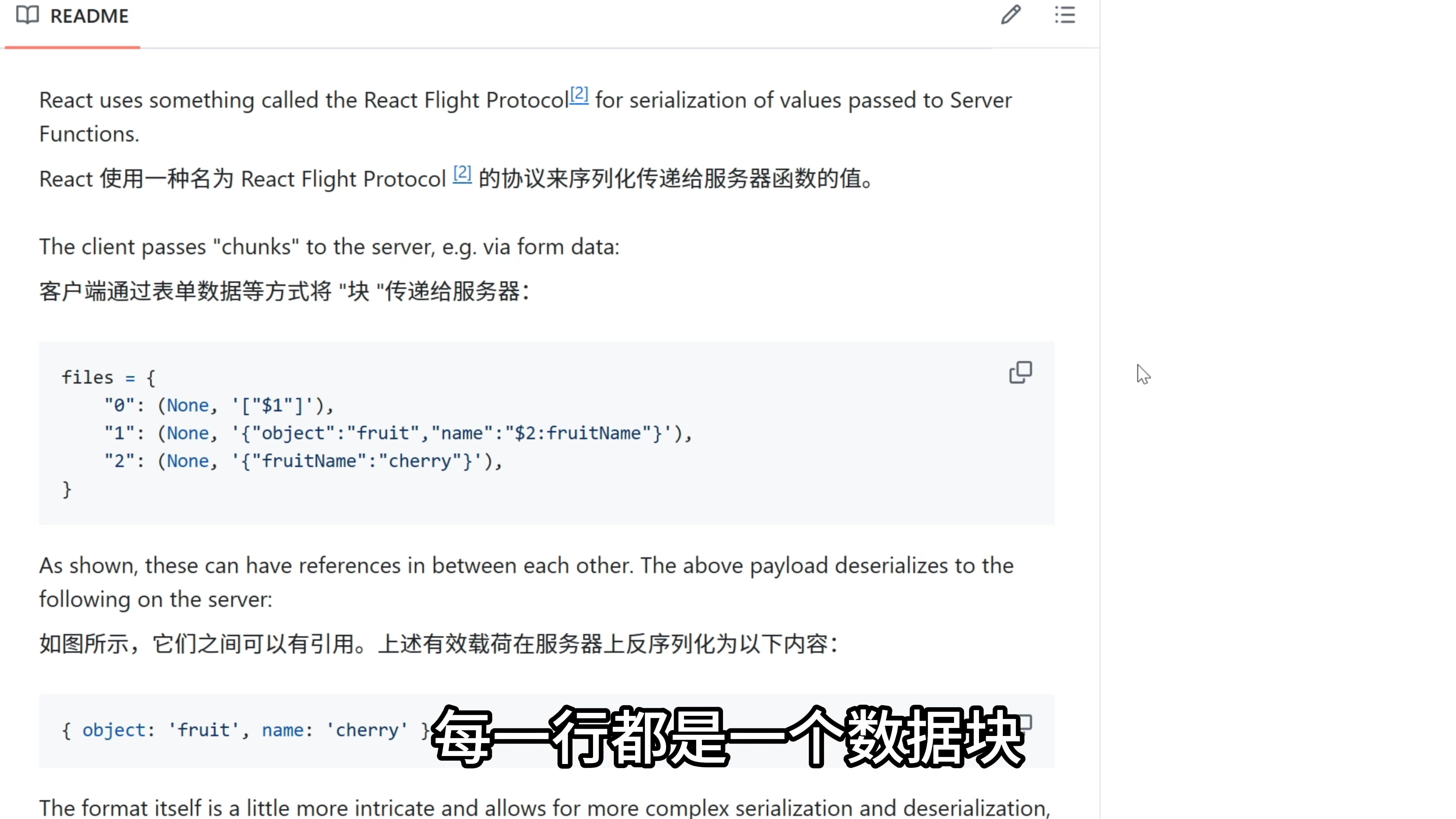 在我们用的这个 Python 脚本的仓库里面,有关于这个漏洞的详细解释。我不是 React 专家,这里我只能简单总结一下。我们看到,React 使用一种叫做 flight 的协议,把客户端的数据序列化后传到服务器,每一行都是一个数据块。
