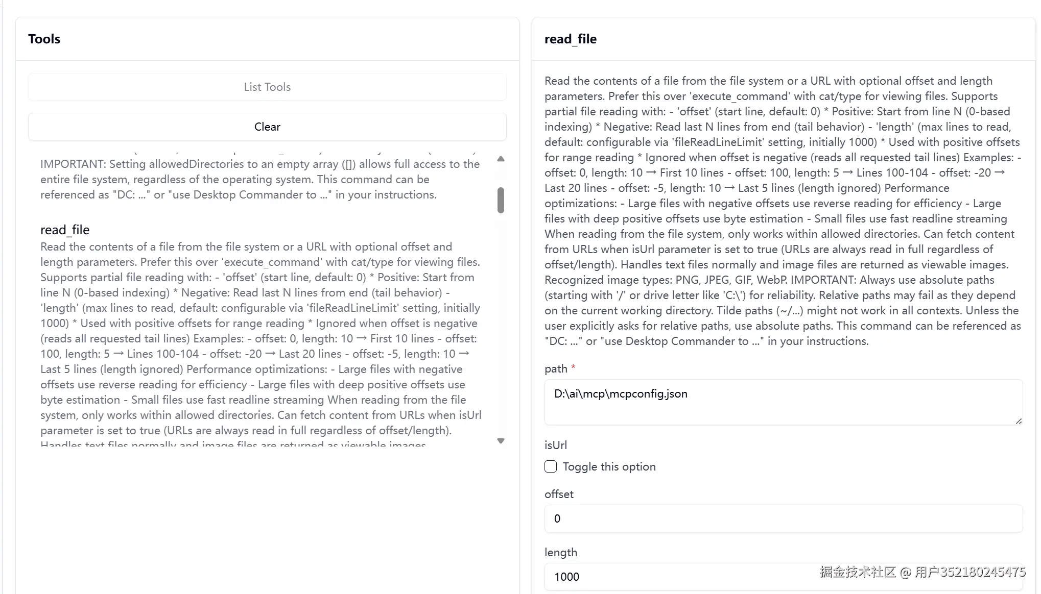 功能:读取具体的文件内容。 示例:读取D:imcpmcpconfig.json 文件的内容。