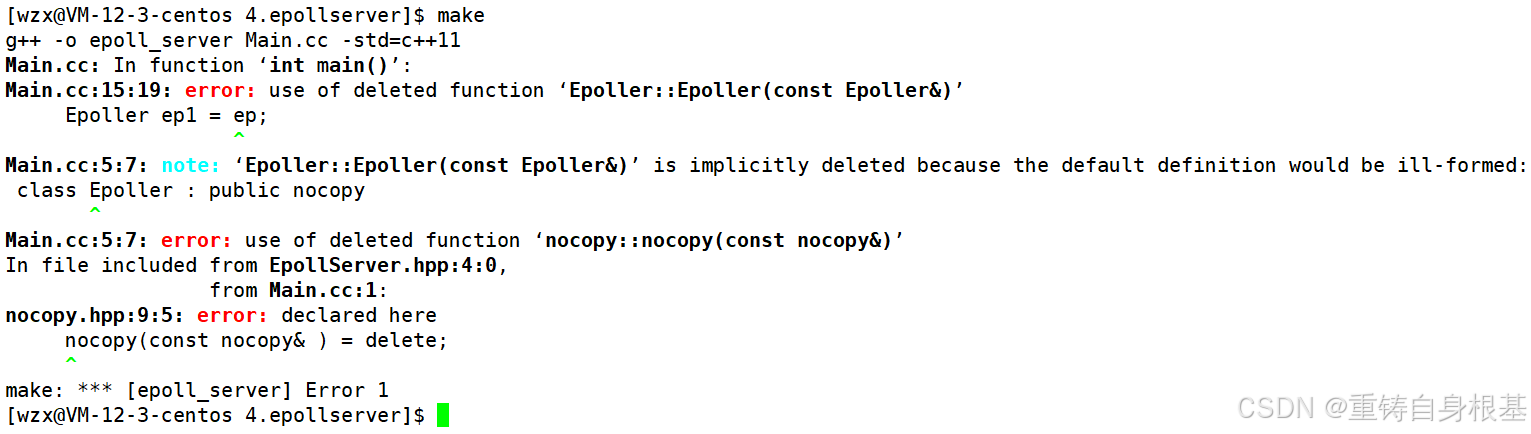 - 所以此时我们在main函数中,尝试一下对公有继承自nocopy的类Epoller进行拷贝构造