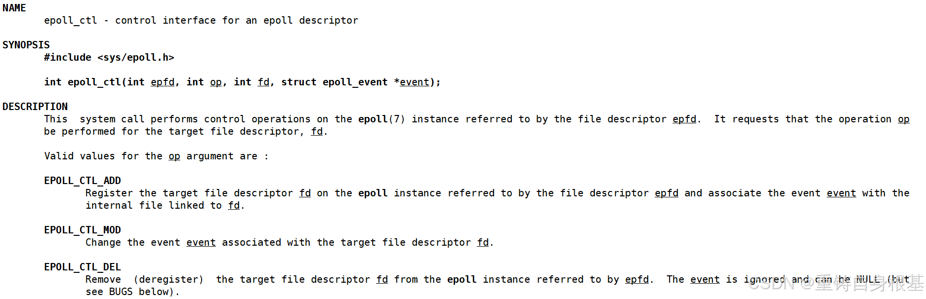 - 所以我们观察上图,oper分为三种,分别是EPOLL_CTL_DEL删除节点,EPOLL_CTL_ADD新增节点,EPOLL_CTL_MOD修改节点,那么其实我们思考一下,epoll_ctl本质上是操作的epoll模型中的红黑树,并且红黑树节点的键值key是文件描述符sock,节点value中包含文件描述符sock和event事件