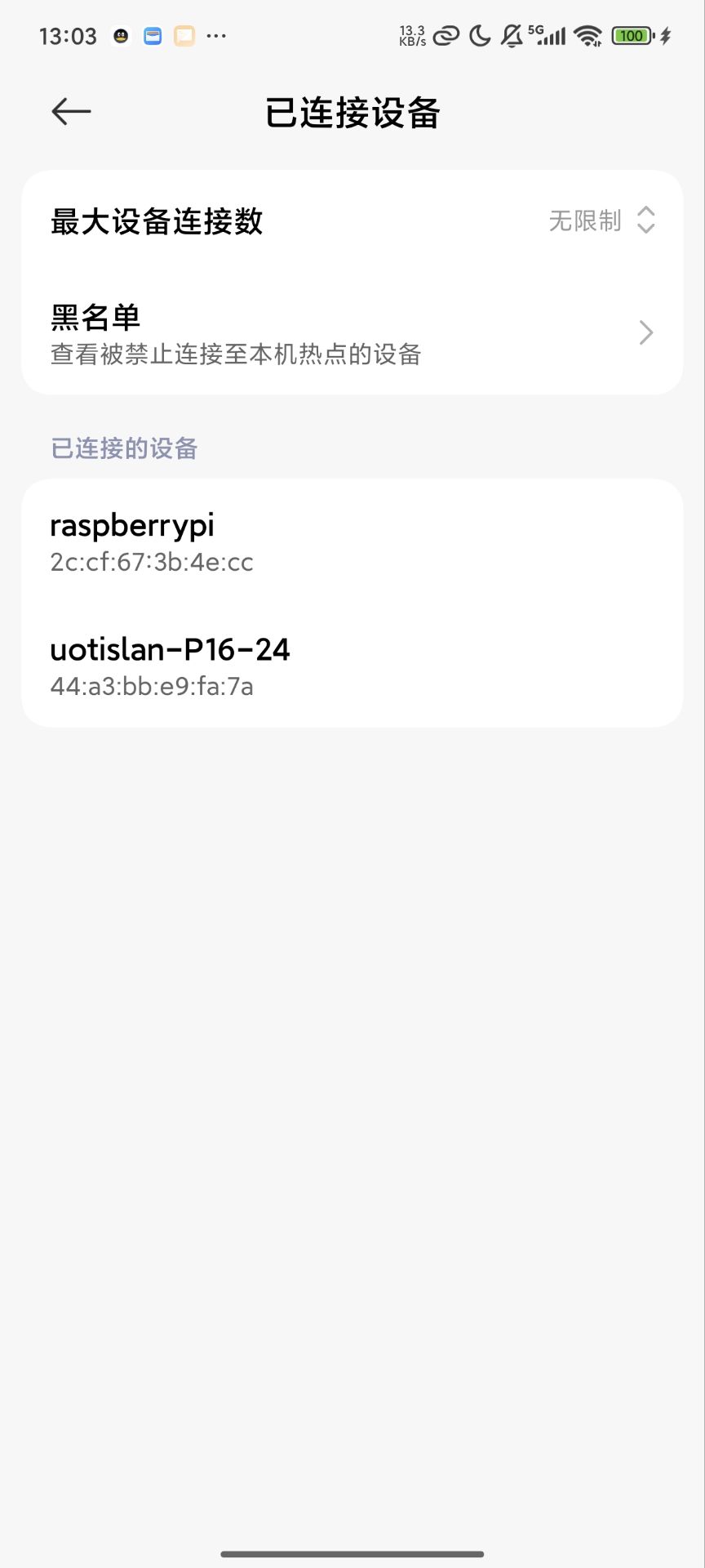 在进行完上面的操作之后,把SD卡插进树莓派,接好网线,通电,不出意外的话树莓派就会启动了,然后在手机热点界面也是可以看到树莓派的,然后就可以通过ssh连接了 ,用户名密码就是刚才设置的时候设置的那个
