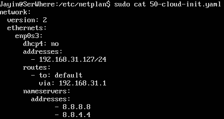 `network: # 网络配置根节点 version: 2 # Netplan 配置语法版本 ethernets: # 配置有线网卡 enp0s3: # 网卡名称 dhcp4: no # 关闭 DHCP,改用静态 IP addresses: # 配置 IP 地址和子网