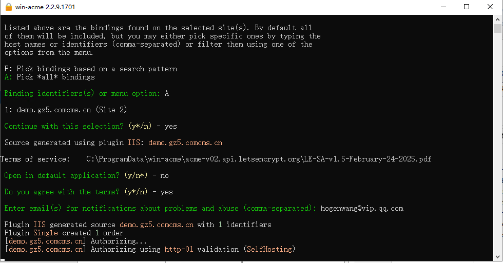接下来,就会提示你是哪个站点,然后就是查看协议和同意协议。然后让你输入邮箱。最后他就自动去验证、下载证书和部署,这个过程全自动。