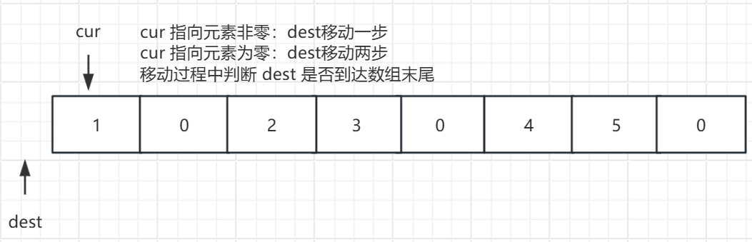 这个问题同样可以使用双指针,定义 cur 指向数组起始位置,定义 dest 指向数组起始位置前一个位置(即-1),然后先判断 cur 位置的值,如果非零,dest 向后移动一步,如果是零,dest 向后移动两步,并且移动过程中判断 dest 是否移动到数组末尾,到末尾遍历结束,cur位置就是最后一个复写的数,否则 cur 继续向后遍历。