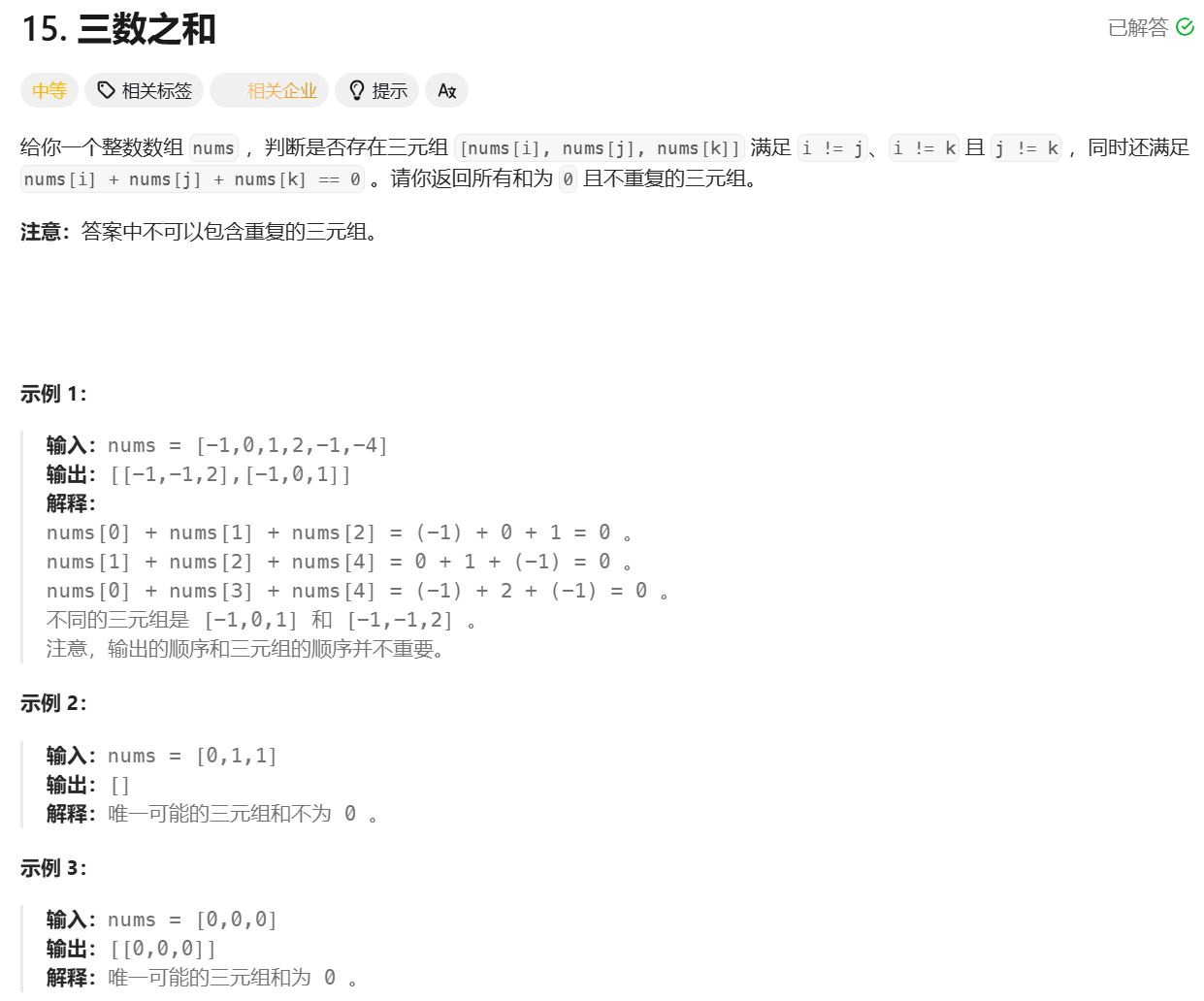 排序:如果不排序,会出现符合条件的三元组的三个值都相同,但是顺序不同,要去重就需要对每个三元组单独在排序然去重,但是如果先排序在找三元组,值相同的情况下,顺序一定相同,结合容器去重更加方便。
