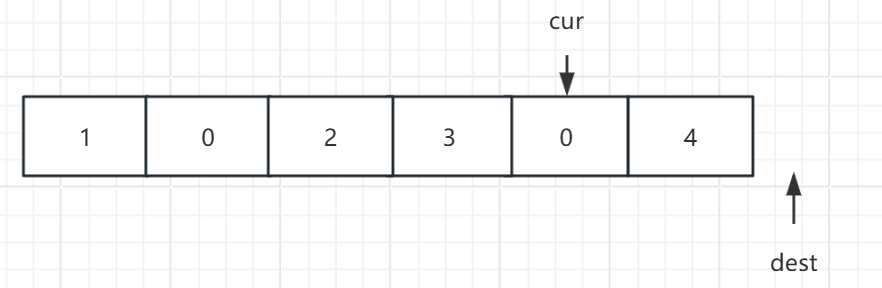 遍历过程:按照上图区间划分,dest 和 cur 中间应该存放元素 0,所以遇到 0 时,dest 指针不动,cur 向后移动即可(这样就将 0 放在它们两个指针中间了),如果不是 0,需要先将 dest 向后移动一个位置,然后交换两指针指向元素,然后cur向后移动一个位置,如图: