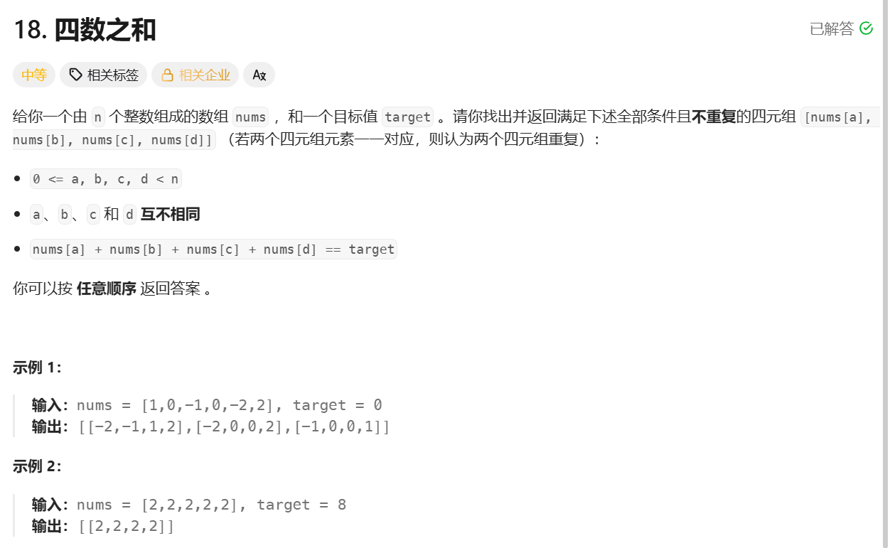 思路:这道题的思路和三数之和一样,只不过三个数变成了四个数,需要两重循环固定两个数,然后再使用双指针,并且本题的目标值是外部给的。