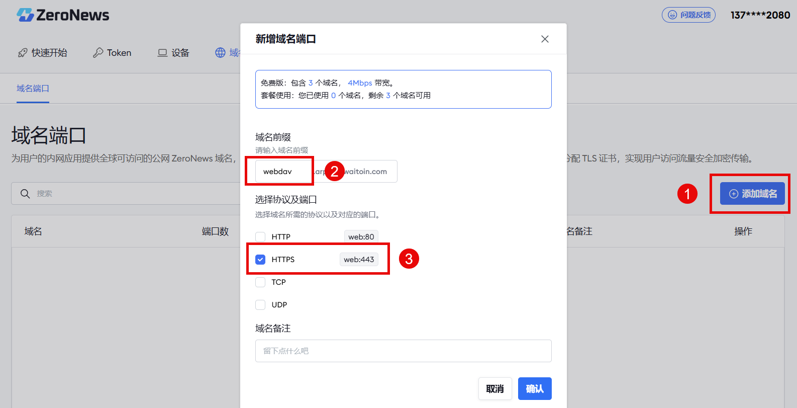 - 域名前缀: 用户输入定义的 域名前缀,如 webdav