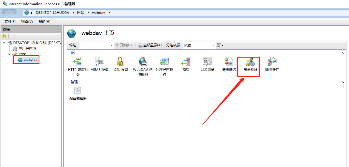 - 选中 “WebDAV” ,进入网站设置界面,点击 "身份验证",启用 "基本身份验证",禁用 "Windows 身份验证" 及 "匿名身份验证"。