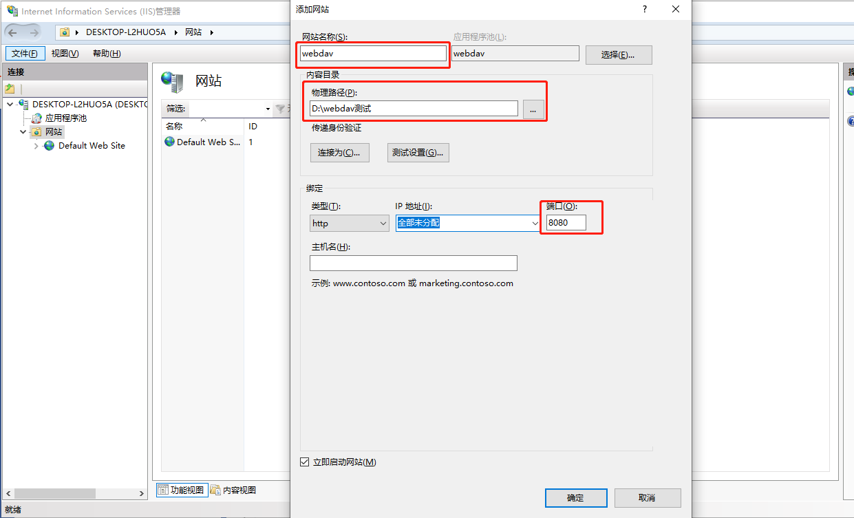 - 在添加网站界面下,输入网站名称,如 "webdav",选择要分享的文件路径,输入端口号(如 8080),然后点击确定完成 WebDAV 网站添加。