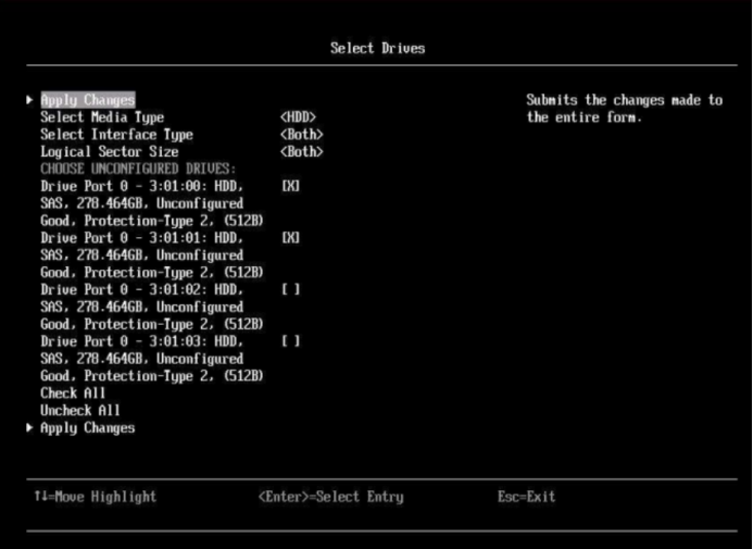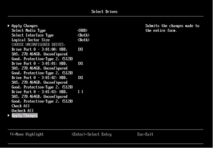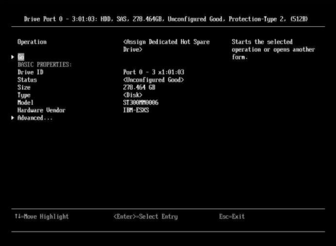 若需提升容错能力,可在创建时勾选一块额外磁盘作为 Global Hot Spare(全局热备)或 Dedicated Hot Spare(专用热备)。在阵列卡配置主界面进入 Drive Management,选择 1 块状态为 Unconfigured Good 状态的硬盘。