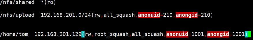 并将所有用户及所属的组映射为nfs-upload,其UID和GID均为210