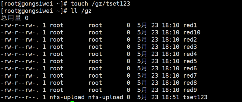 4.创建测试文件和查看目录权限,确保所有用户可读 /nfs/shared 路径下文件