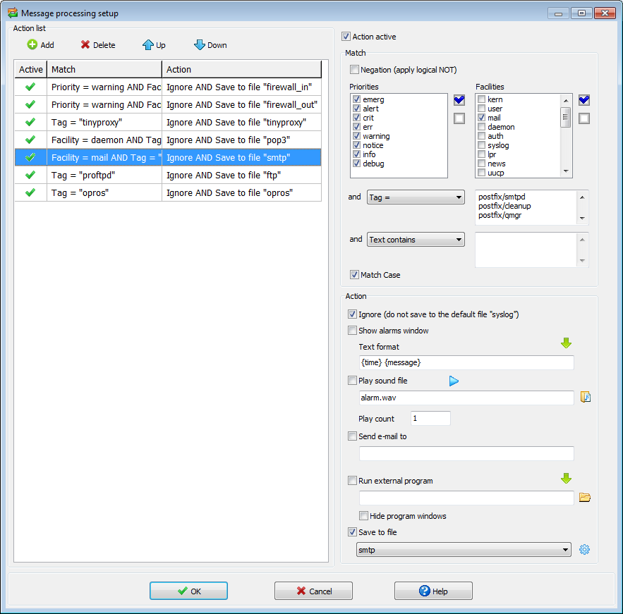 规则2:Facility = mail AND Tag = "smtp" → 忽略默认日志 + 保存到专用文件