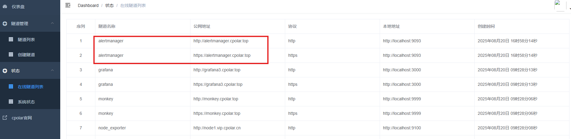 隧道名称:可自定义,本例使用了:alertmanager,注意不要与已有的隧道名称重复