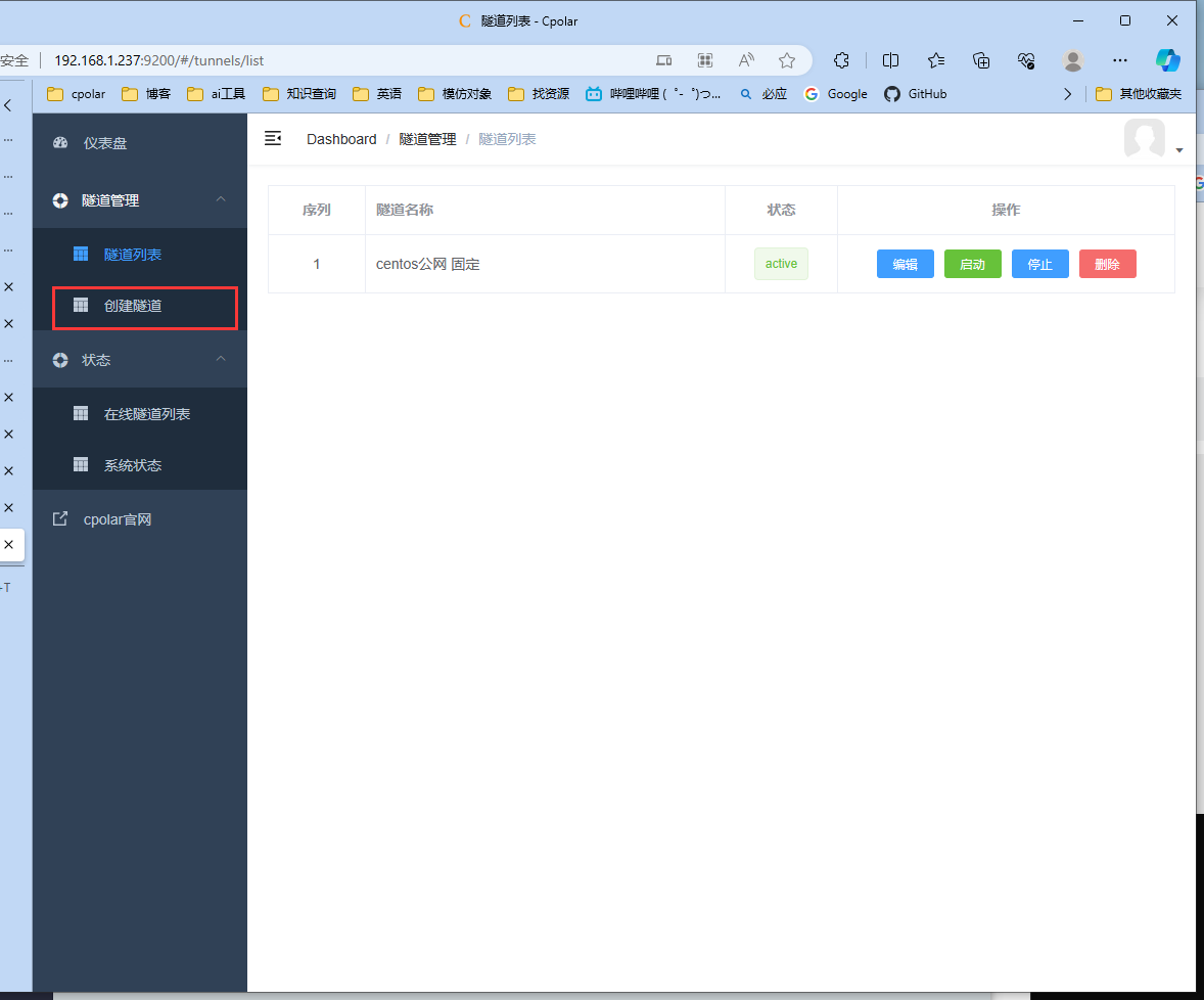 返回登录http://192.168.1.237:9200 Cpolar Webui管理界面,点击左侧仪表盘的隧道管理——隧道列表,找到所要配置的隧道,点击 编辑