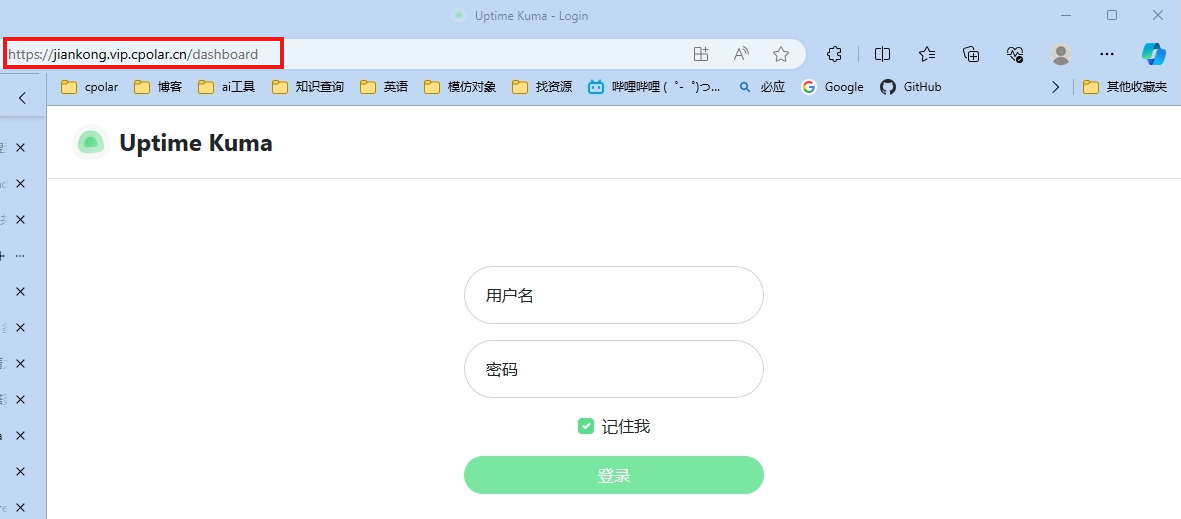 而 Uptime Kuma 与 cpolar 结合后,这些困扰就能轻松解决。cpolar 可以将本地的监控服务暴露到公网,生成一个可远程访问的地址,无论身在何处,只要有网络就能登录 Uptime Kuma 管理界面,实时查看监控数据、调整告警阈值,甚至在外出时也能及时处理服务器异常,让监控真正做到全天候、无死角。