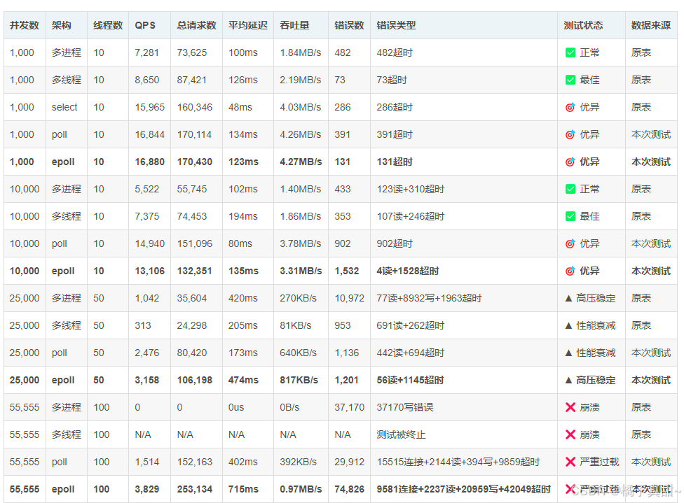 | 1,000 | epoll | 10 | 16,880 | 170,430 | 123ms | 4.27MB/s | 131 | 131超时 | 🎯 优异 | 本次测试 |