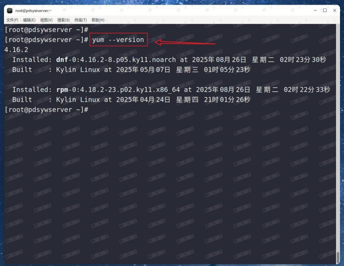 [root@pdsywserver ~]# yum --version 4.16.2 Installed: dnf-0:4.16.2-8.p05.ky11.noarch at 2025年08月26日 星期二 02时23分30秒 Built : Kylin Linux at 2025年05月07日 星期三 01时05分23秒 Installed: rpm-0:4.18.2-23.p02.ky11.x86_64 at 2025年08月26日 星期二 02时22分33秒 Built : Kylin Linux at 2025年04月24日 星期四 21时01分26秒