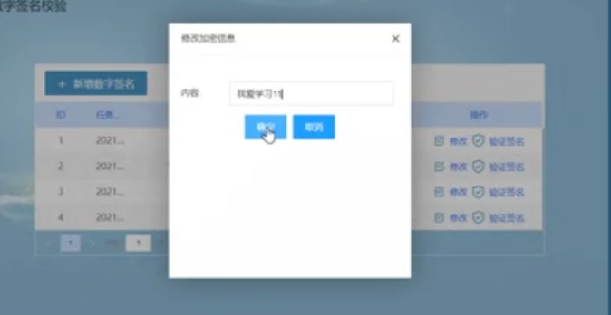 上述已经完成签名验证的信息,点击修改,将原有“我爱学习”的内容修改为“我爱学习11”点击确认完成内容的修改,如下图所示: