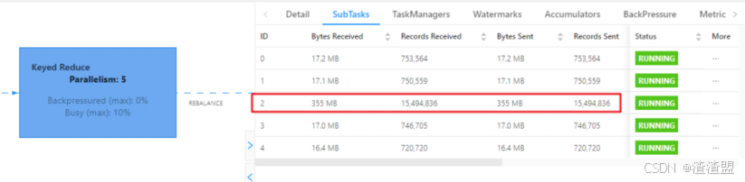 相同 Task 的多个 Subtask 中,个别 Subtask 接收到的数据量明显大于其他Subtask 接收到的数据量,通过 Flink Web UI 可以精确地看到每个 Subtask 处理了多少数据,即可判断出 Flink 任务是否存在数据倾斜。通常,数据倾斜也会引起反压。