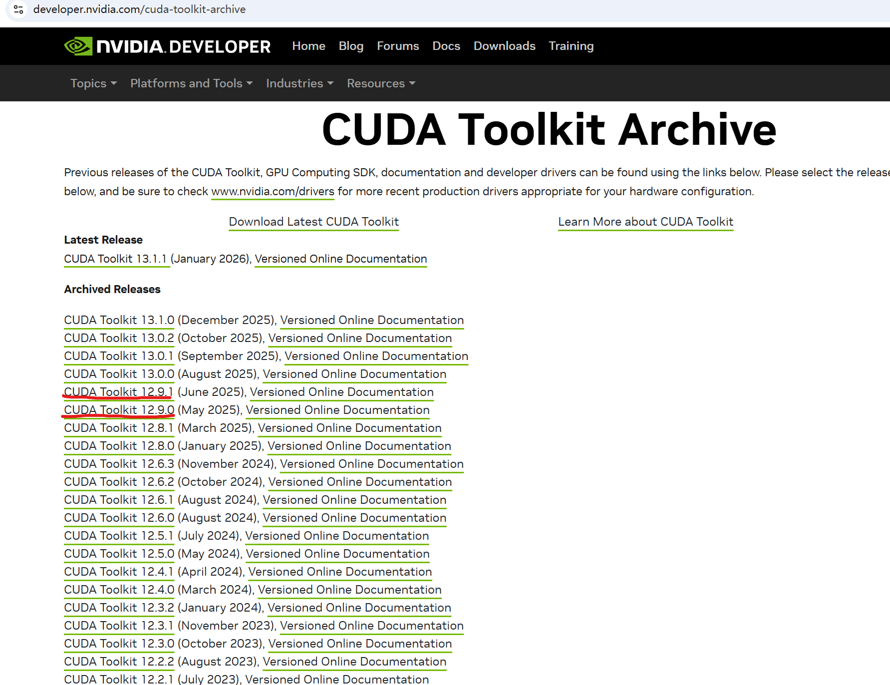 这里注意没有12.9的版本,但是12.8是兼容的,所以我们可以安装12.8的GPU版本的,对应下面就是中间第三个