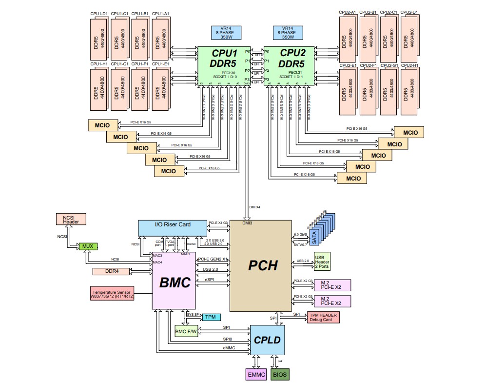 Supermicro 为该系统定制了 X13DEG-OAD 主板,专用于此平台,并不兼容超微 4U 通用液冷 HGX H100/H200 系列。其核心目标是为 PCIe 交换架构提供 MCIO PCIe 连接支持。