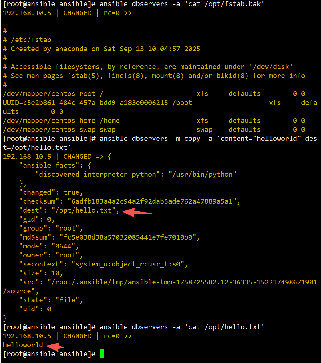 ansible dbservers -m copy -a 'content="helloworld" dest=/opt/hello.txt' #将helloworld写入/opt/hello.txt文件中