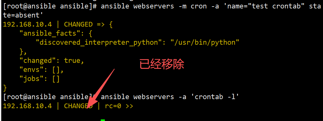 ansible webservers -m yum -a 'name=httpd state=absent' #卸载服务